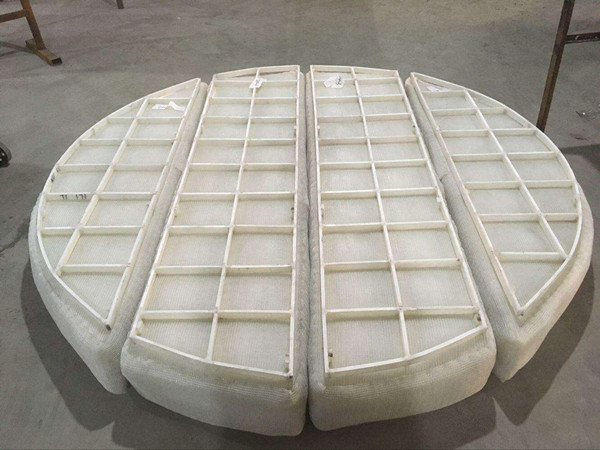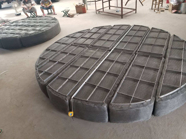 絲網(wǎng)除沫器的結(jié)構(gòu):主要是由絲網(wǎng)、絲網(wǎng)格柵組成絲網(wǎng)塊和固定絲網(wǎng)塊的支承裝置構(gòu)成,絲網(wǎng)為各種材質(zhì)的氣液過濾網(wǎng),氣液過濾網(wǎng)是由金屬絲或非金屬絲組成。氣液過濾網(wǎng)的非金屬絲由多股非金屬纖維捻制而成,亦可為單股非金屬絲。該絲網(wǎng)除沫器不但能濾除懸浮于氣流中的較大液沫,而且能濾除較小和微小液沫,廣泛應(yīng)用于化工、石油、塔器制造、壓力容器等行業(yè)中的氣液分離裝置中。